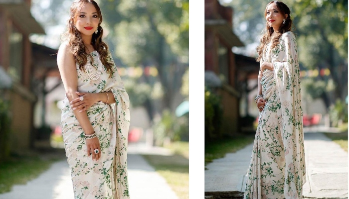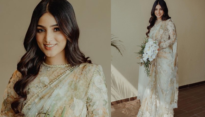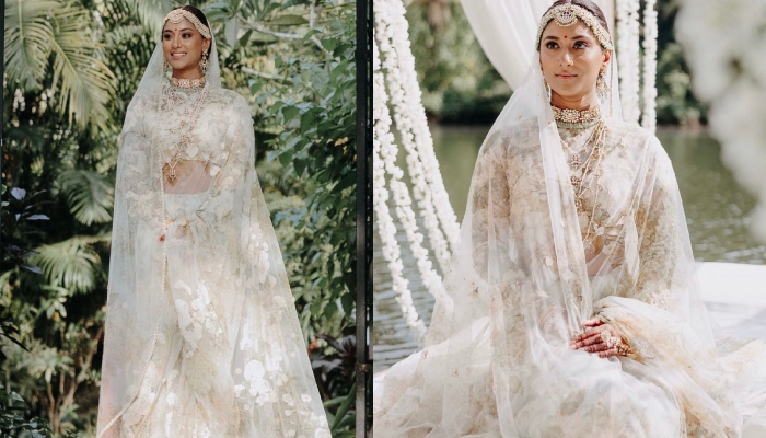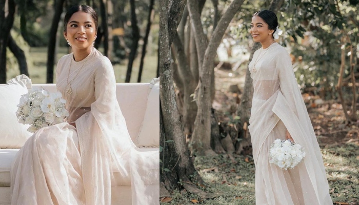 If you are not a fan of sequins and heavy embroideries and want to keep your look minimal, then take inspiration from Bashini Liyanapathirana, who donned a minimal cream-toned saree with a closed-neck blouse. She kept her look subtle for her wedding registration in Colombo, Sri Lanka.