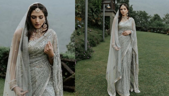Another bride, Pari Bishnoi picked a soft grey-toned see-through saree with sequinned detailing from Sabyasachi Mukherjee's collection. Her outfit was a breath of freshness as she got engaged in Darjeeling, India. Without over-accessorising her look, the bride opted for a minimal choker neckpiece, matching earrings, and a maangteeka. She also wore a matching dupatta which was tucked on her head.