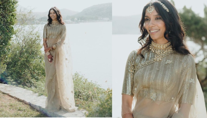 Another bride, who left our jaws dropped with her choice of outfit, is Rania Kabadi, who wore a Sabyasachi bespoke saree for her wedding in Athens Riviera, Greece. She kept her look minimal and ditched the heavy embroidered sarees. She picked a golden-toned net saree, which she styled with a sequinned golden blouse. She kept her look subtle with soft makeup and hair left open.