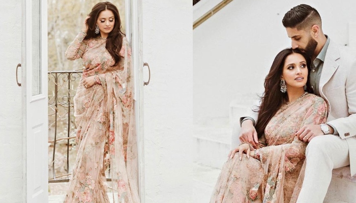 Another bride, who ditched the heavy-sequinned saree, and picked soft-pink toned floral saree from Sabyasachi Mukherjee's collection for her engagement ceremony. She styled her look with statement earrings.