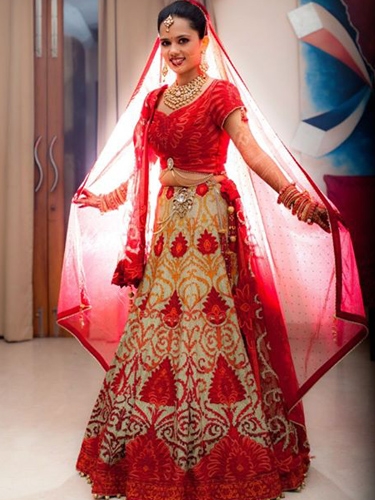 Indian brides and the colour red certainly goes hand in hand. Here is our beautiful bride, Jaya the bride, looks like a million bucks in her red and beige wedding lehenga. Her lehenga looks rich yet subtle, which makes it perfect when accompanied with traditional gold bridal jewellery. What we love is the detailing on her choli, which adds extra charm to her entire outfit!