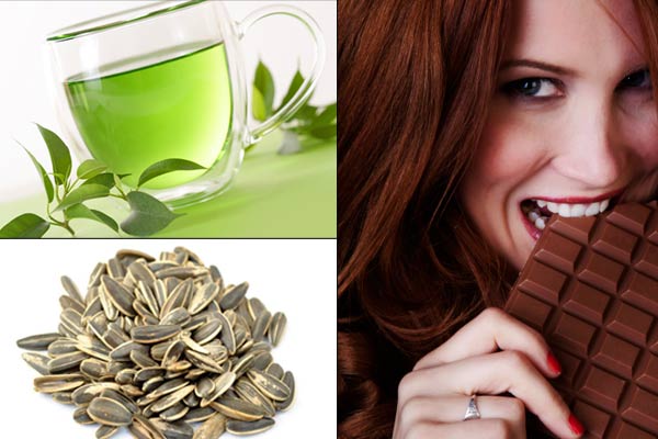 Food items like dark chocolate, sunflower seeds, green tea, etc., are packed with antioxidants. Sunflower seeds are rich in vitamin E, also known as the beauty vitamin. As this is a scientifically proven fact, it is no coincidence that almost all latest anti-ageing skin creams use vitamin E as a key ingredient. It is no secret that dark chocolate and green tea contain polyphenols. Polyphenols are a class of antioxidants that can suppress agents that trigger inflammation, keep skin hydrated and lessen the effects of sunburn.
