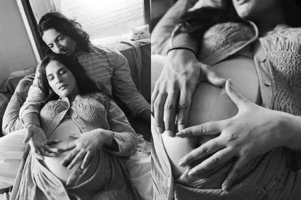 Another new mommy who served us with a monochrome look was Richa Chadha. The Fukrey actress did her maternity shoot with a bare baby bump and its close-up shot for the first time. In one photo, Richa sat on the sofa of her home in her husband, Ali Fazal's arms, wearing a white partially unbuttoned shirt as the soon-to-be parents caressed the baby bump. However, the picture's highlight was their cat, Kamli, photobombing the moment.
