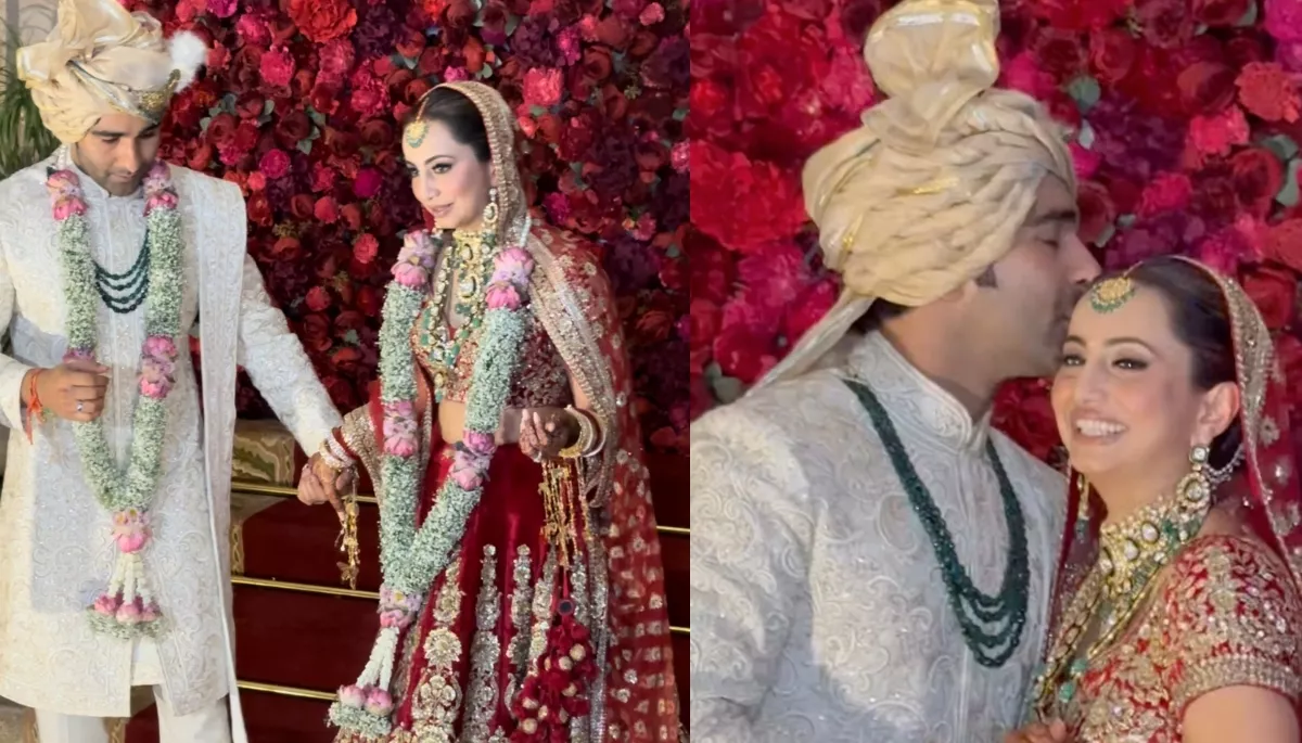 We also loved how Aadar showered love on his newly-married wife, Alekha by giving a quick peck on her forehead. However, the bride blushed while photographers clapped and blessed the newly-married couple.