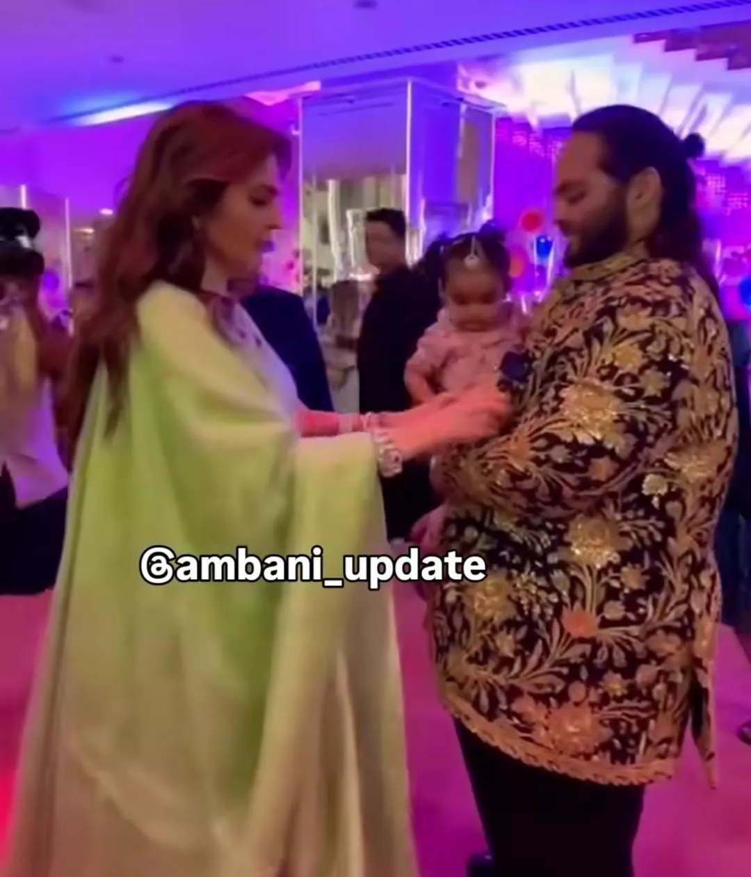 Anant Ambani slipped into a gold-embellished sherwani from the shelves of Abu Jani Sandeep Khosla for his sangeet. In a video that surfaced online, we can see Mukesh Ambani holding Aadiya in his arms while Anant spread his hands to take the little one. Moreover, it was Aadiya, who was curious about the diamond and emerald-encrusted tiger brooch that her mamu had worn. The little one donned a pink-toned ghagra choli, and a tiny maang teeka made her look extremely cute.