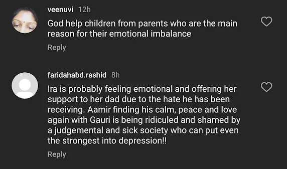"Ira is probably feeling emotional and offering her support to her dad due to the hate he has been receiving. Aamir finding his calm, peace and love again with Gauri is being ridiculed and shamed by a judgemental and sick society that can put even the strongest into depression!!"