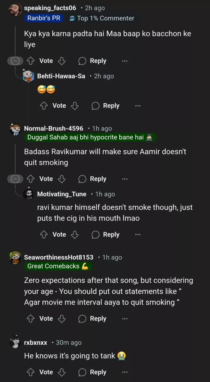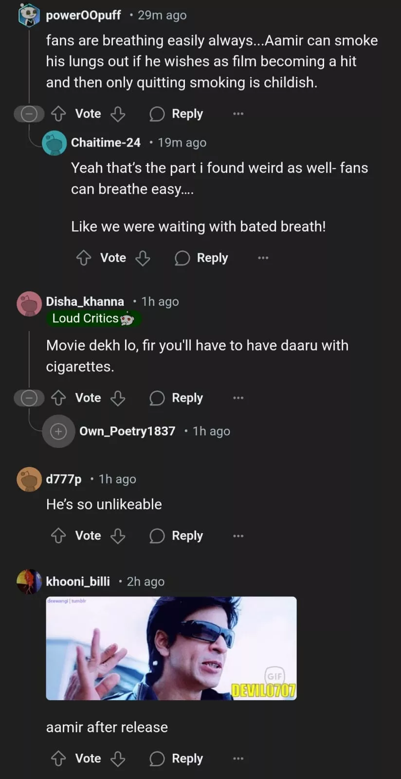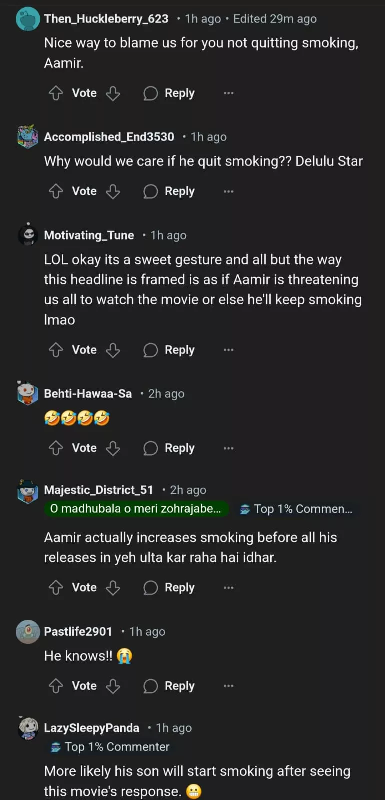 Although Aamir Khan is yet to confirm the statement regarding his pledge to quit smoking, the news already found its way to Reddit, and as always, netizens had tons of opinions to share. Several users jokingly called the statement an 'easy way' to avoid quitting the habit. One netizen penned, "Bro just wanted to continue smoking and took the easy way out. Respect the hustle," while another wrote, "Nice way to blame us for you not quitting smoking, Aamir. Inki creativity toh dekho." Yet another commenter wrote, "LOL okay its a sweet gesture and all but the way this headline is framed is as if Aamir is threatening us all to watch the movie or else he'll keep smoking lmao."