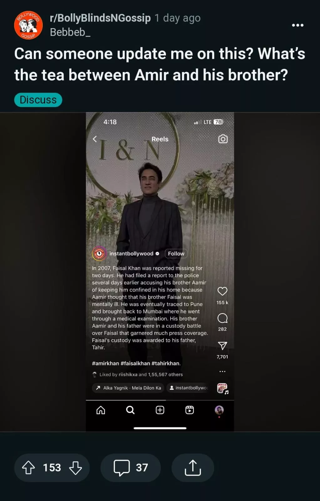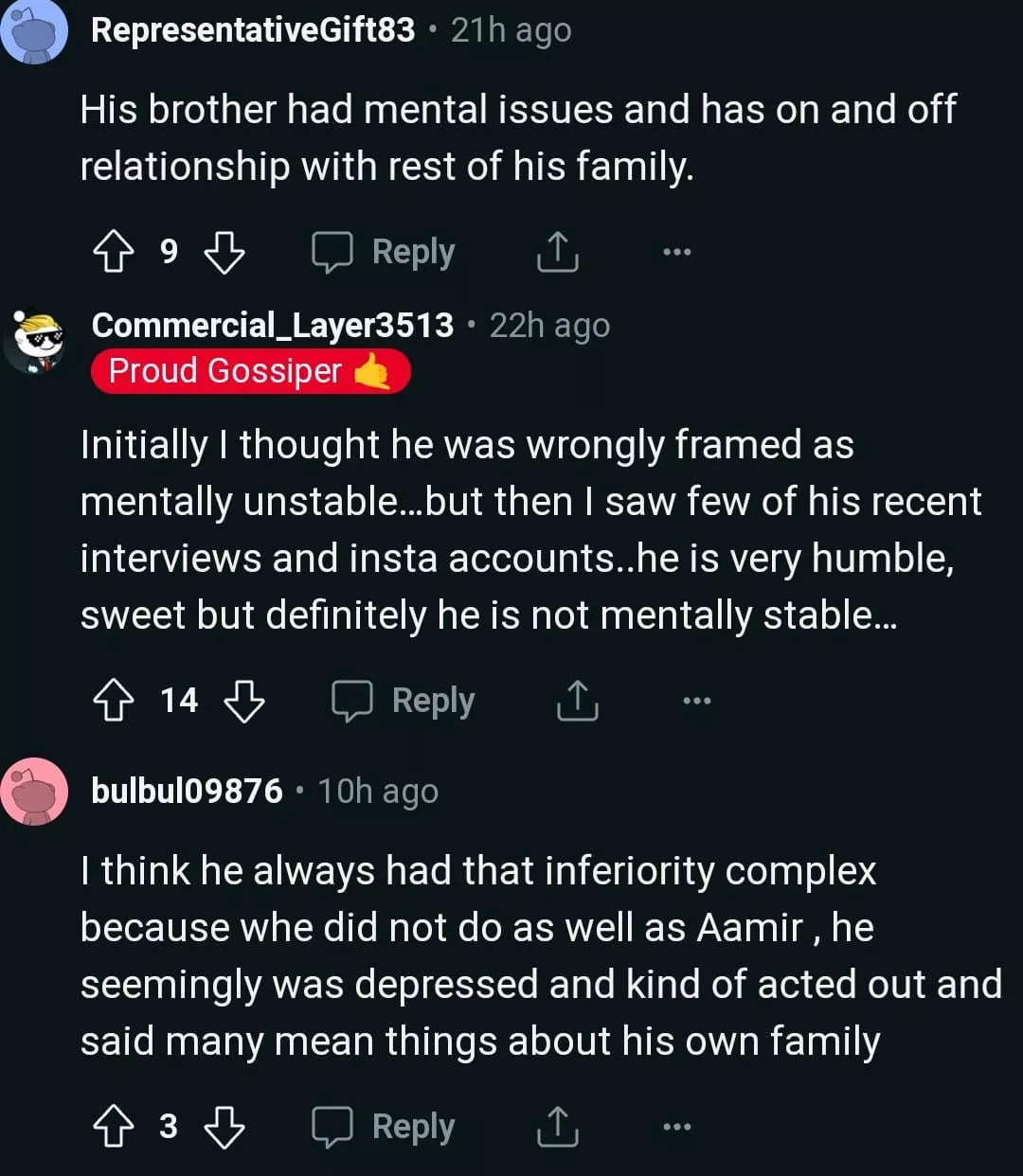 Soon, many other netizens started commenting on the same. While one netizen mentioned how it is extremely difficult for a person to take care of another mentally ill family person, another Reddit user penned, "Mental illness runs in Aamir Khan's family." One more user's comment can be read, "I think he always had that inferiority complex because whe did not do as well as Aamir , he seemingly was depressed and kind of acted out and said many mean things about his own family."