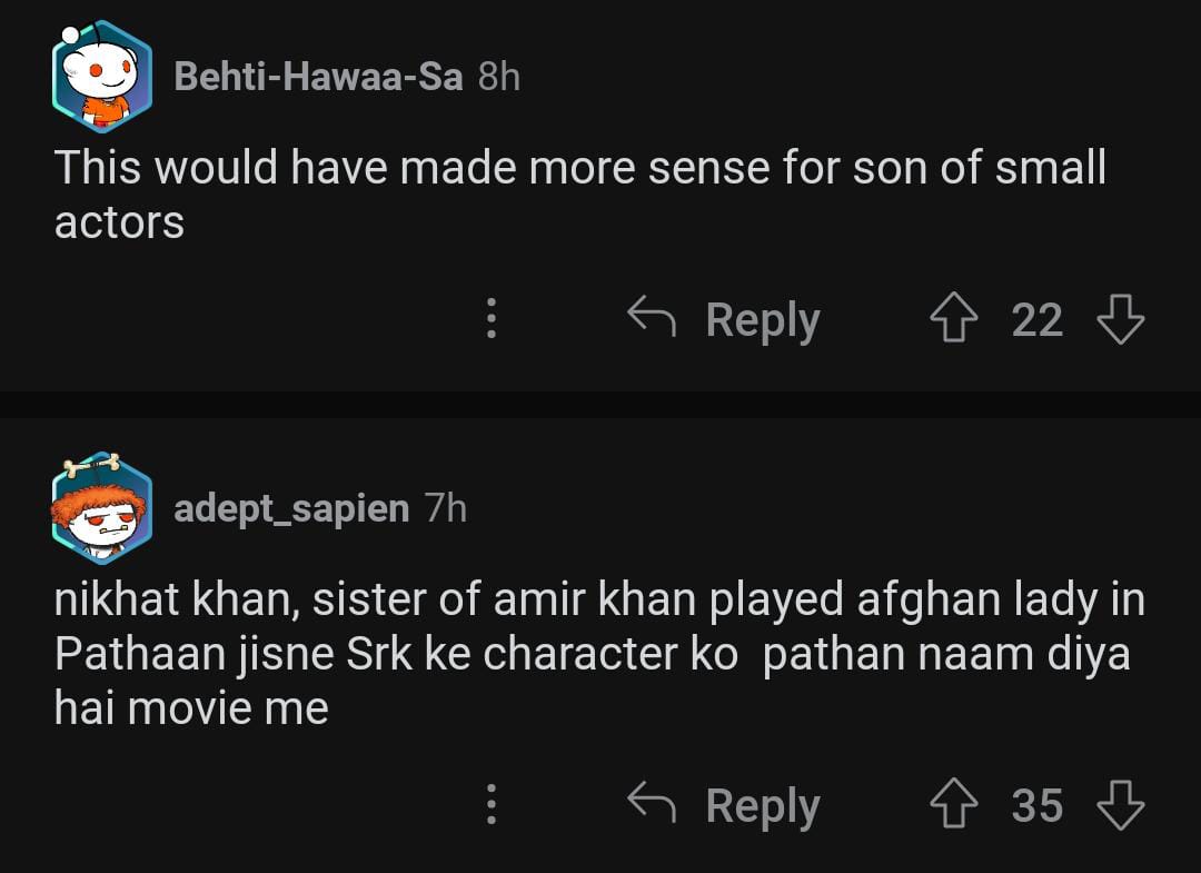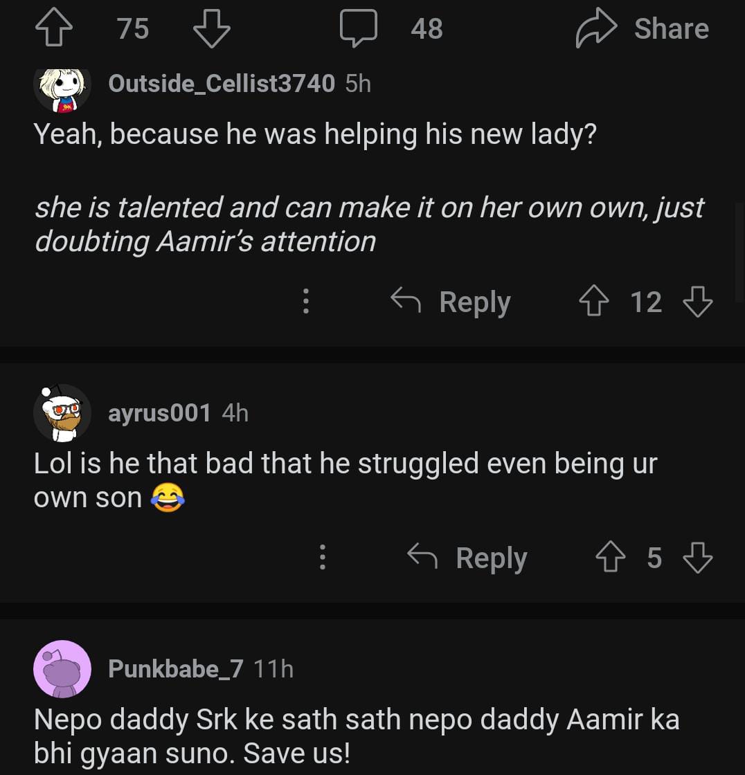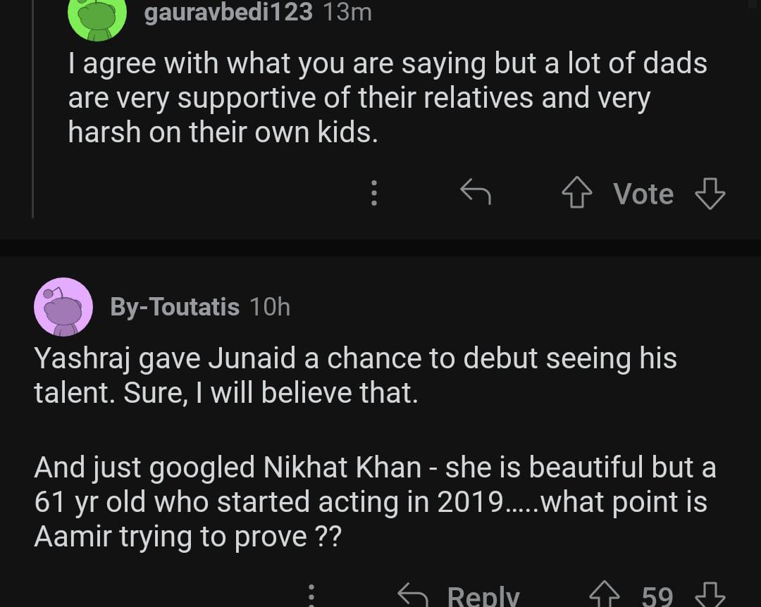 As soon as the video went viral, netizens rushed to the comment section to drop their opinions. Reacting to the video, one user wrote, "Yashraj gave Junaid a chance to debut seeing his talent. Sure, I will believe that. And just googled Nikhat Khan - she is beautiful but a 61 yr old who started acting in 2019…..what point is Aamir trying to prove ??" Another user commented, "This would have made more sense for son of small actors." A third comment reads, "Nepo daddy Srk ke sath sath nepo daddy Aamir ka bhi gyaan suno. Save us!" Check the comments below: