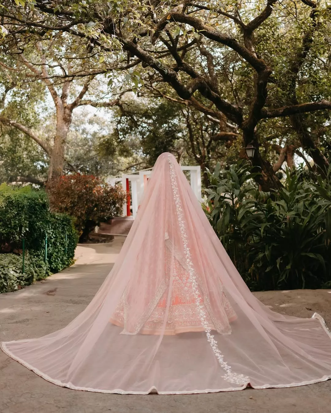 Her look was elevated by a sheer veil in peach-tone. Manish Malhotra did creative justice here by keeping the same tone as the groom, Armaan's ensemble. The veil had a trail and in the middle portion, the embroidery of roses was made of white threads.