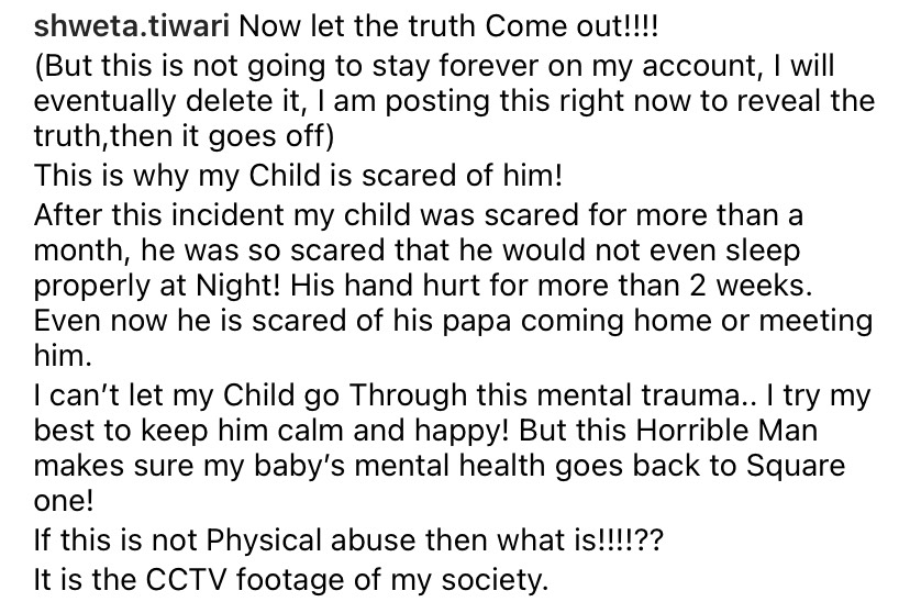 Coming back to Shweta’s videos, she had captioned them as "Now let the truth Come out! (But this is not going to stay forever on my account, I will eventually delete it, I am posting this right now to reveal the truth, then it goes off.) This is why my Child is scared of him! After this incident my child was scared for more than a month, he was so scared that he would not even sleep properly at Night! His hand hurt for more than 2 weeks. Even now he is scared of his papa coming home or meeting him. I can’t let my Child go Through this mental trauma. I try my best to keep him calm and happy! But this Horrible Man makes sure my baby’s mental health goes back to Square one! If this is not Physical abuse then what is! It is the CCTV footage of my society."