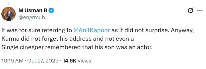 Another user revealed that it was Anil’s karma that kept his son, Harsh Varrdhan Kapoor, from becoming an established star. The user wrote, “It was for sure referring to @AnilKapoor as it did not surprise. Anyway, Karma did not forget his address and not even a single cinegoer remembered that his son was an actor.”