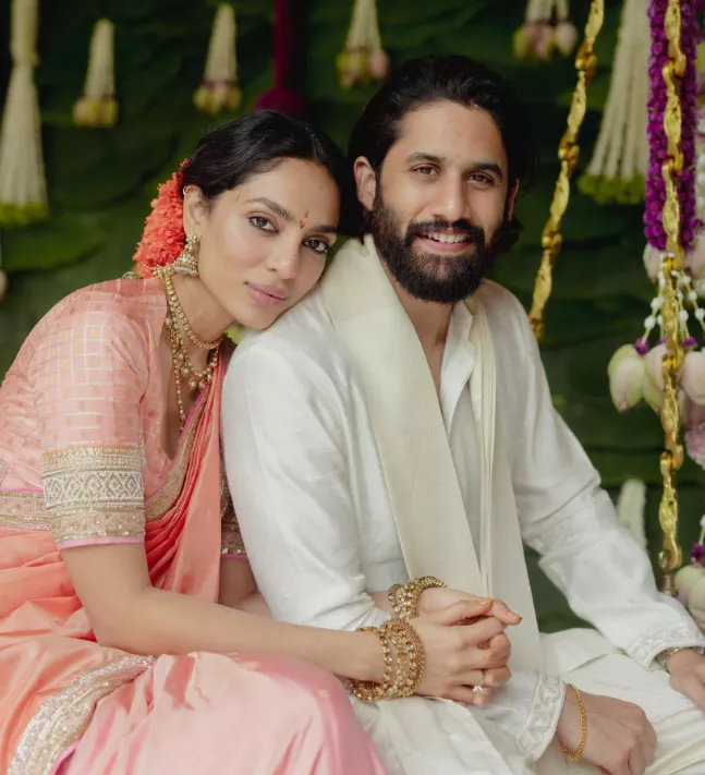 In the pictures from their engagement, Sobhita looked drop-dead gorgeous in a pink-hued silk saree from the shelves of Manish Malhotra. She paired the saree with a matching blouse and opted for sleek pieces of gold jewellery to complete her look. Meanwhile, her fiance, Chaitanya, wore an ivory-hued white kurta-pyjama and a matching doshala.