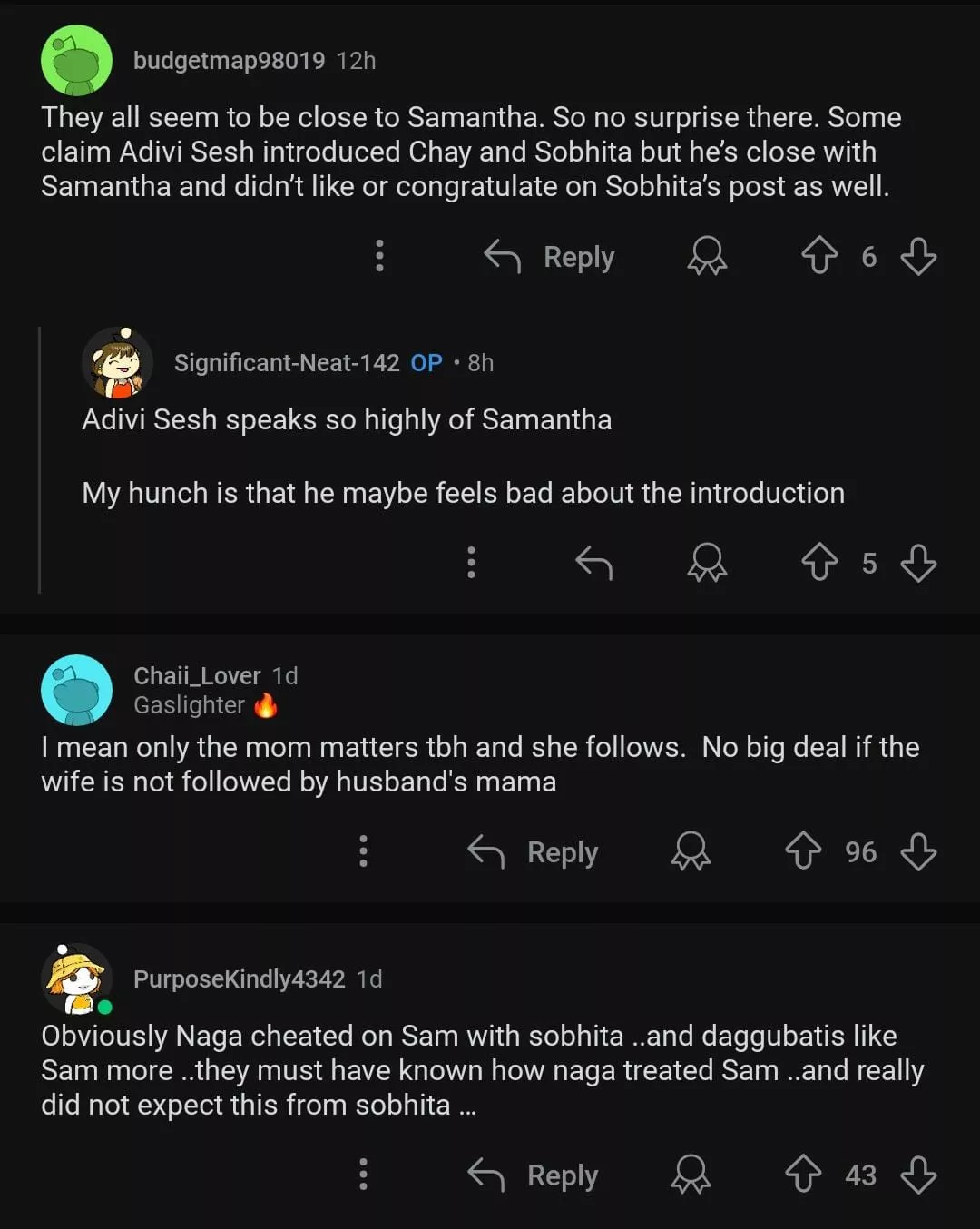 The post, which was shared on the discussion platform, featured several screenshots that highlighted that the Daggubati family wasn't following Naga Chaitanya's fiancee, Sobhita, on social media while they follow his ex-wife, Samantha Ruth Prabhu. For the uninitiated, Chaitanya was previously married to Samantha from 2017 to 2021.
