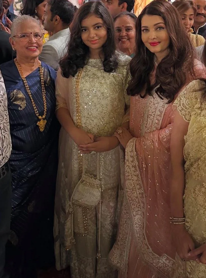 Recently, a photo of Aishwarya Rai Bachchan with Aaradhya and Brinda Rai made rounds on the discussion platform, Reddit. In the photo, which was from a wedding ceremony, the three generations of the Rai girls looked gorgeous. Aishwarya looked pretty in a blush-pink-toned salwar suit. A soft touch of makeup and open hair added stars to her look. Aaradhya, too, looked cute in an ivory-toned sequined salwar suit. On the other hand, Brinda Rai was dolled up in a blue-hued saree. Moreover, the three ladies from the Rai family left us in awe with their glam up.