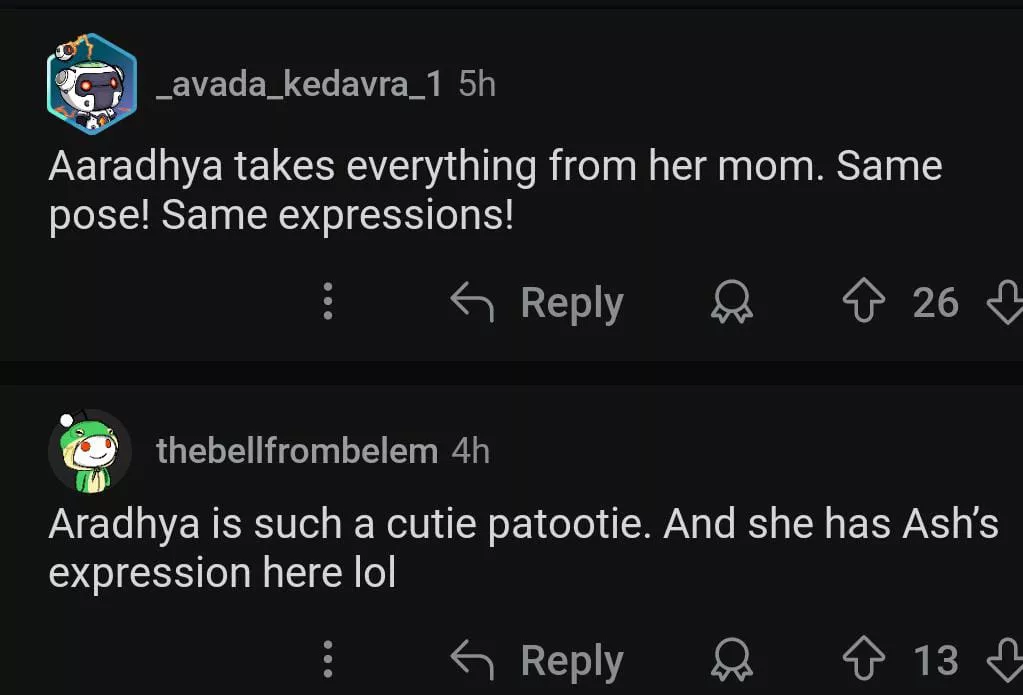 As soon as the photo made rounds on the discussion platform, Reddit, netizens rushed to the comment section and dropped their opinions. Reacting to the photo, one user penned, "Wow..Aradhya will be one tall girl. She's already as tall as Ash." Another user commented, "So nice to see Aish’s mom looking healthy and happy, like her old self. Wishing her good health." A third user penned, "Aaradhya takes everything from her mom. Same pose! Same expressions."