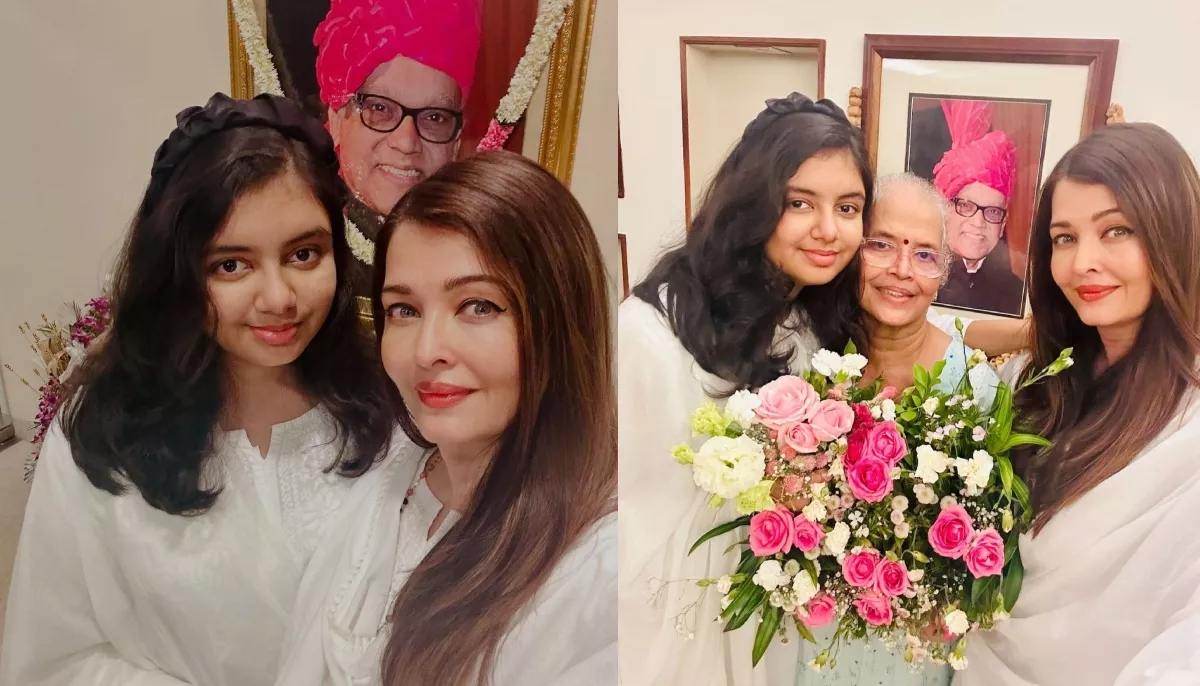 In another photo, we can see Aishwarya and Aardhya posing together, along with a huge portrait of the former's father. Aishwarya looked a bit emotional, as we could clearly see her watery eyes, and she was trying her best to control her emotions. In another photo we could see Aishwarya, Aardhya posing with the former's mother, Brinda Rai.