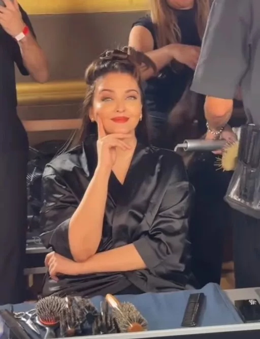 The media team recorded a video of Aishwarya getting ready for the day. When Aish spotted the camera, she sportingly posed for it, winked at the lens, and said hello. The diva was dressed in a black silk robe in the video while the makeup and hair team were running their magic on her.