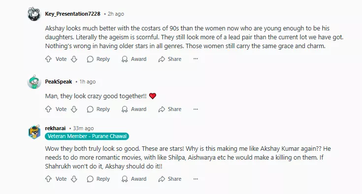 “Wow, they both truly look so good. These are stars! Why is this making me like Akshay Kumar again?? He needs to do more romantic movies, with like Shilpa, Aishwarya etc he would make a killing on them. If Shahrukh won't do it, Akshay should do it!!”