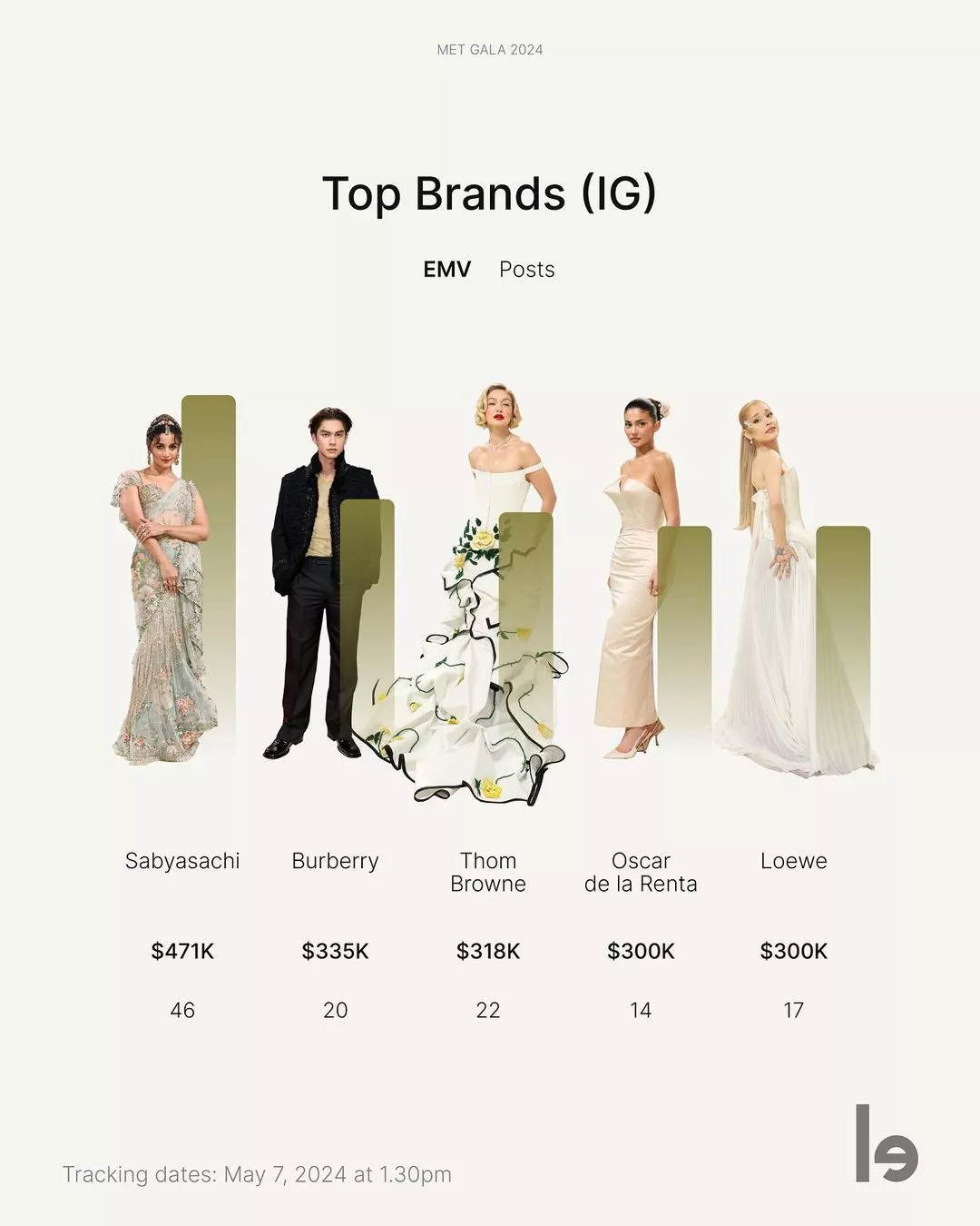Not just Alia but the brand, Sabyasachi emerged at the top, leaving behind other extremely popular luxury brands such as Burberry, Thom Browne, Oscar de la Renta, and Loewe. While Alia’s earned media value (EMV) was reported to be USD 4.2 million, which is around INR 35 crore, upon conversion, Sabyasachi’s EMV was estimated to be USD 471K, approximately INR 3.93 crore.