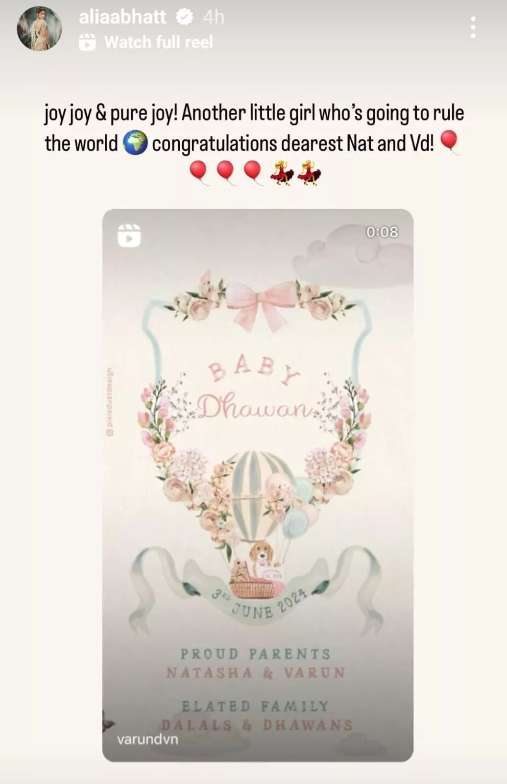 Taking to her IG handle, on June 4, 2024, Alia Bhatt reposted Varun Dhawan’s official announcement about the arrival of his and his wife, Natasha Dalal's baby girl, on behalf of both the Dhawan and Dalal families. Resharing it, Alia wrote a heartfelt note atop her Instagram Stories. Indeed, with the sweet message penned by Alia, it seems she was brimming with excitement upon hearing the news. Alia wrote:
