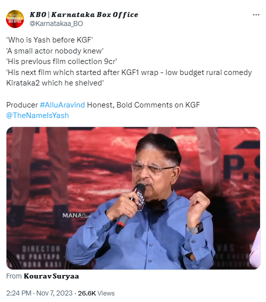 On November 7, 2023, Allu Aravind graced the teaser launch of the upcoming Telegu movie, Kotabommali PS, which is directed by Teja Marni and stars Meka Srikanth, Varalaxmi Sarathkumar and Rahul Vijay, among others. During the course of the event, Aravind was asked certain questions about the impact of actors' fees on a film's budget. However, while talking about the same, when Allu Arjun's father made an absurd comment about the popular actor, Yash, the latter's fans got upset with it and brutally trolled Aravind.