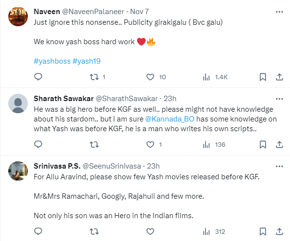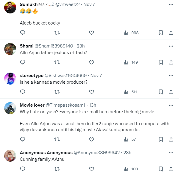 As soon as the clipping of Allu Aravind's comment on Yash was uploaded on social media, the latter's fans got extremely upset with the former and brutally slammed him. While one user compared his son, Allu Arjun to Yash and wrote, “Even Allu Arjun was a small hero in tier-2 range, who used to compete with Vijay Devarakonda until his big movie Alavaikuntapuram lo”, another fan of the KGF fame mentioned, “KGF is special only because of Yash. It is unimaginable without him. That is his contribution. What's this guy's problem?” Check out the comments:
