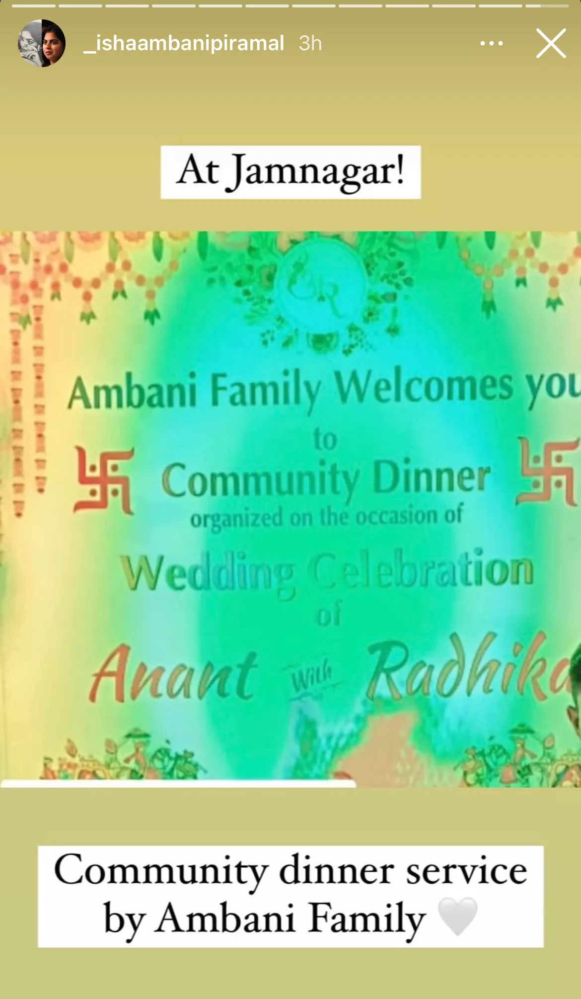 "Ambani family welcomes you to community dinner organised on the occasion of the wedding celebration of Anant with Radhika."