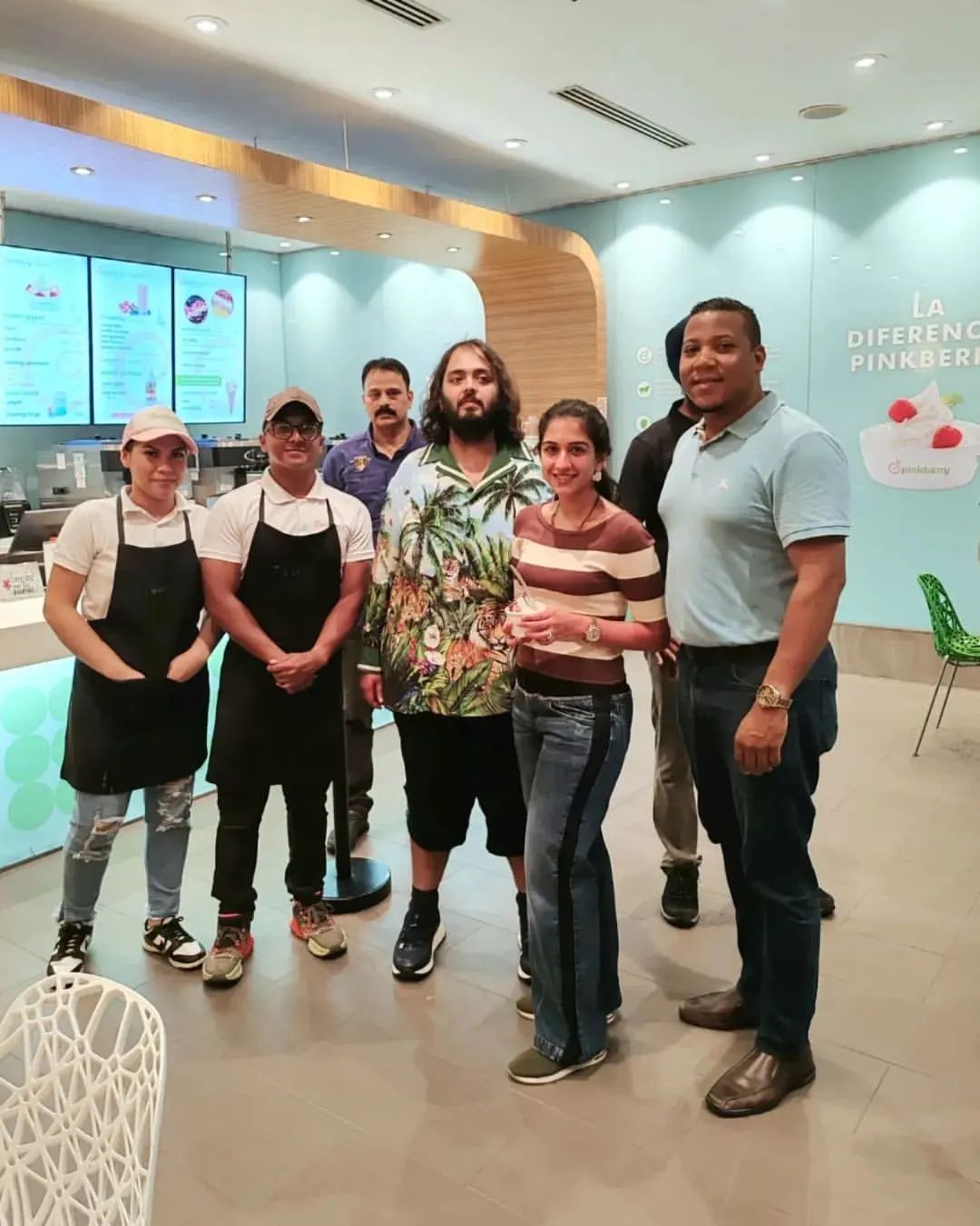 Another photo of the couple, Anant and Radhika from their honeymoon made rounds on social media. In the photo, the duo was seen posing with the staff of a local shop, Pinkberry Panama, as they went out to relish frozen yogurt. In the photo, Radhika looked the prettiest as she was clad in a brown and off-white top, which she paired with flared jeans with black borders. Anant, on the other hand, looked handsome in his signature tropical-printed shirt.