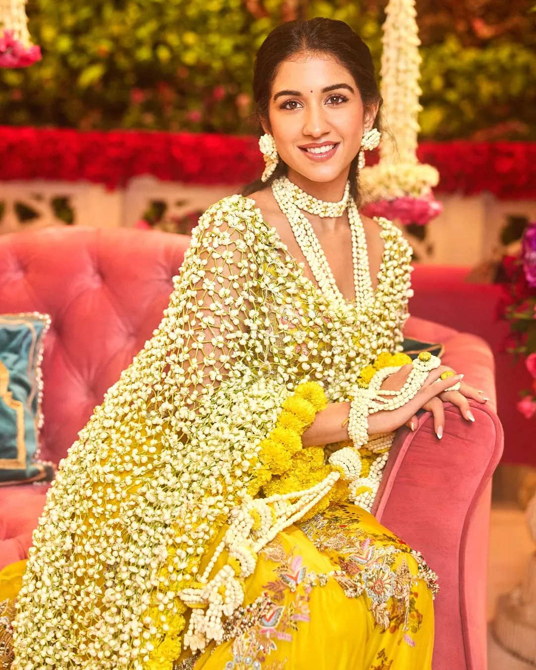 Radhika complemented her look with dainty flower jewellery, a choker neckpiece, matching earrings, and a haath phool. These were all made from mogra buds. A black bindi and half-tied hair completed her look for the haldi.