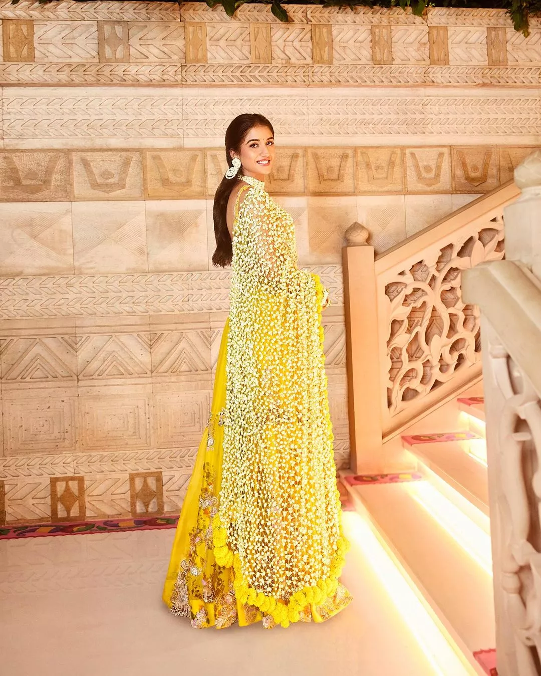 For the haldi day, Radhika wore a yellow-toned Anamika Khanna lehenga. The bride's yellow lehenga was a perfect pick for the haldi ceremony, but it was the real flower dupatta that added stars to Radhika's look. Her dupatta was made of mogra flowers and the borders had yellow marigold flowers. The bride-to-be kept her makeup subtle and on-point.