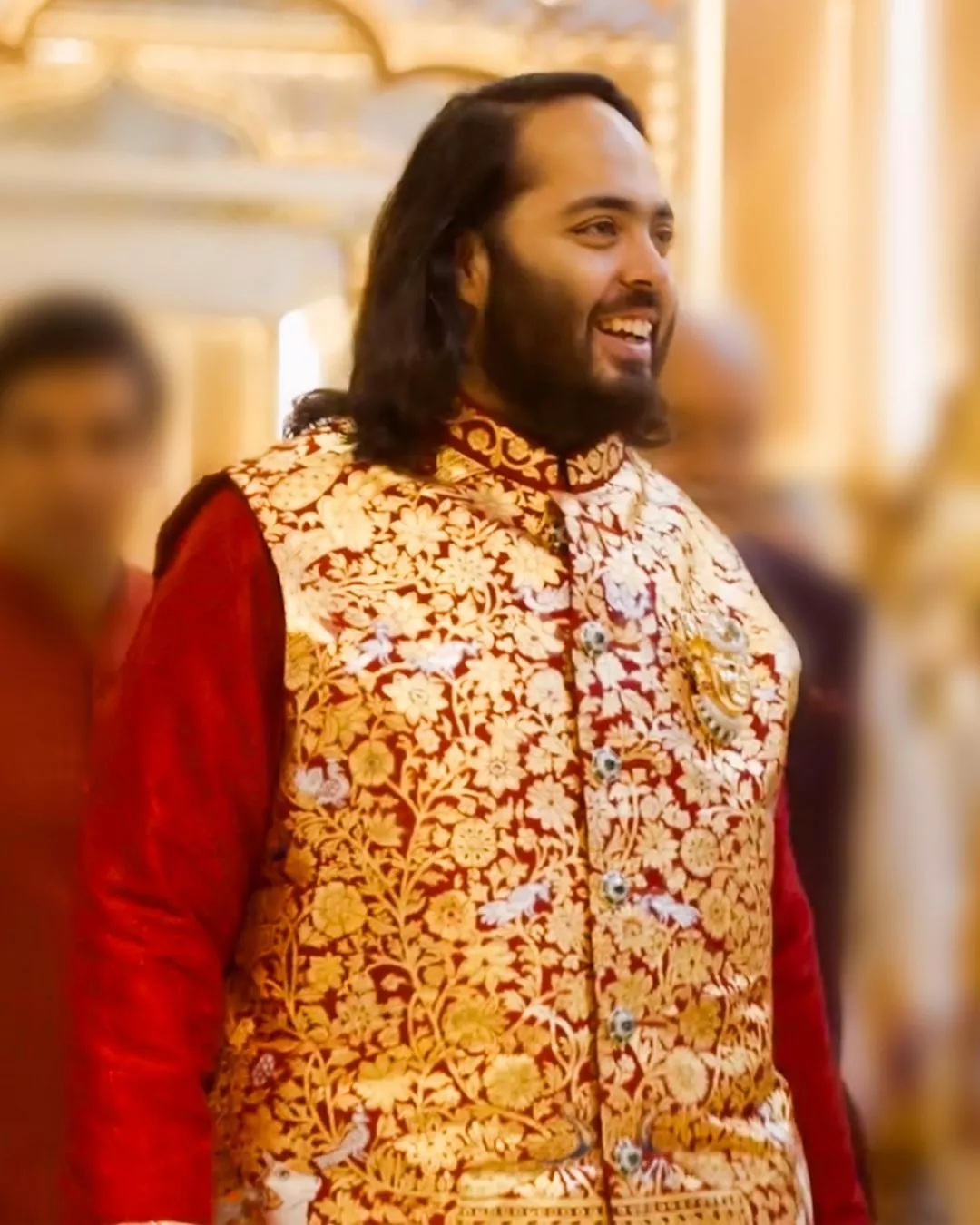 Recently, the designer's official IG page provided a few glimpses of the design of Anant Ambani's jacket. The red bespoke jacket was adorned with artwork inspired by age-old pichwai paintings from the Nathdwara temple in Rajasthan. The paintings depicted themes from Lord Krishna’s life, featuring motifs like lotuses, trees, cows, and peacocks. The designers revealed that it was specially created by Bhilwara artisans and took almost 600 hours to finish. Three expert pichwai artists worked on the jacket in 110 hours using 100 gold leaves. Indeed, it was a piece representing pure traditions.