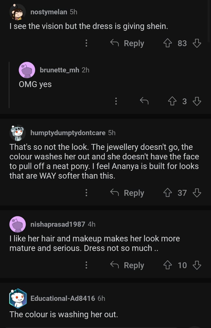 Some photos of Ananya Panday from the Swarovski store opening in NYC were shared on the discussion platform, Reddit. As soon as the photos were dropped, netizens flooded the comment section. While some users praised the diva for her fashion regimen, others remained unimpressed. Reacting to the photos, one user wrote, "That's so not the look. The jewellery doesn't go, the colour washes her out, and she doesn't have the face to pull off a neat pony. I feel Ananya is built for looks that are WAY softer than this." Another user wrote, "I like her hair and makeup makes her look more mature and serious. Dress not so much ..". A third user commented, "The colour is washing her out."