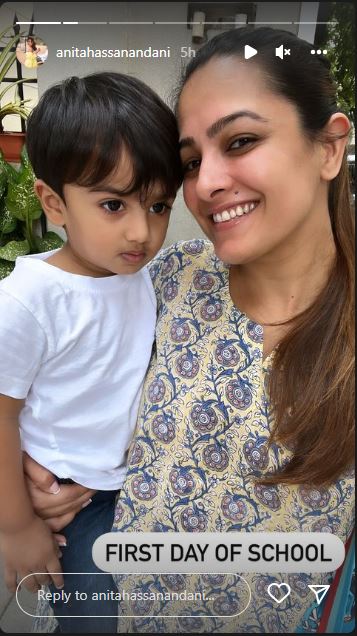 A few hours ago, Anita took to her IG stories to give a sneak peek into her baby boy, Aaravv's first day at school. First, she shared a cutesy selfie with Aaravv and wrote atop it, 'First day of school." In the picture, Anita was brimming with excitement for her baby boy's day. However, the little munchkin seemed a bit nervous while posing for the click.