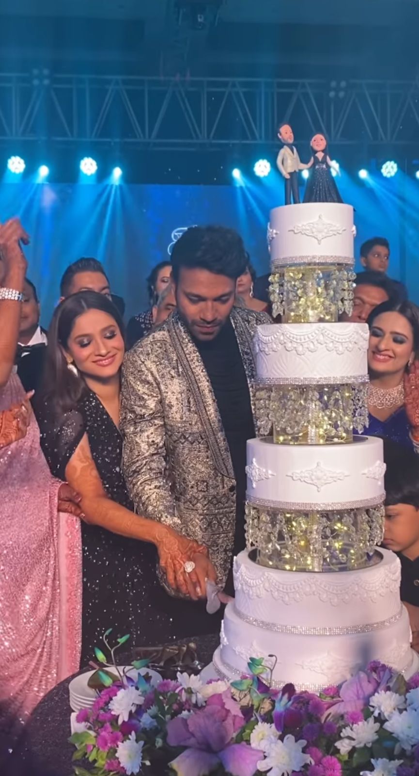 Moreover, what caught our attention was the lavish 4-tier cake that the couple cut for their engagement party. Just like their dreamy engagement ceremony, their cake grabbed eyeballs. But, mostly, the tiny miniatures of the bride and groom at the top tier of the cake won our hearts. The miniature bride wore the matching outfit as the bride-to-be, Ankita Lokhande.