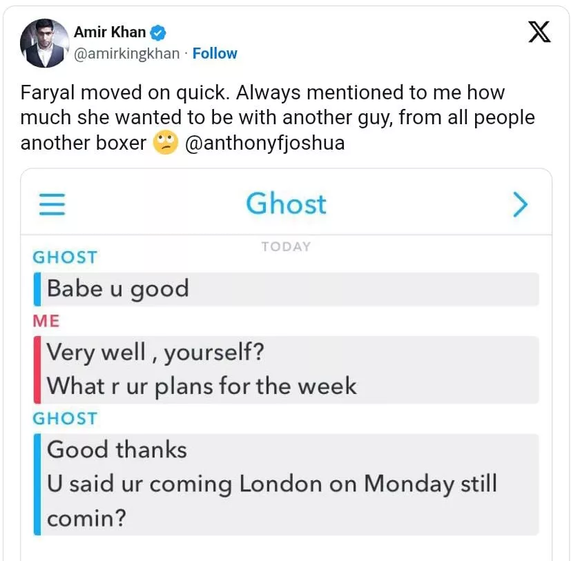 "Faryal moved on quick. Always mentioned to me how much she wanted to be with another guy, from all people another boxer. @anthonyfjoshua"