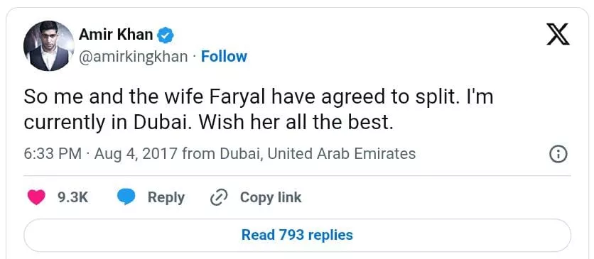 Professional boxer, Amir Khan had once publicly alleged on social media that his wife, Faryal Makhdoom, had cheated on him with fellow heavyweight champion, Anthony Joshua. In August 2017, Amir Khan posted a series of explosive tweets announcing his intention to divorce Faryal. He specifically tagged Anthony Joshua, mockingly suggesting that his wife had "moved up in the weight classes". He so took a dig at Anthony Joshua, stating that he could have Amir's "leftovers". Notably, Anthony Joshua was a father of a two-year-old at that time. Amir's tweet, which generated immense buzz at that time, could be read as: