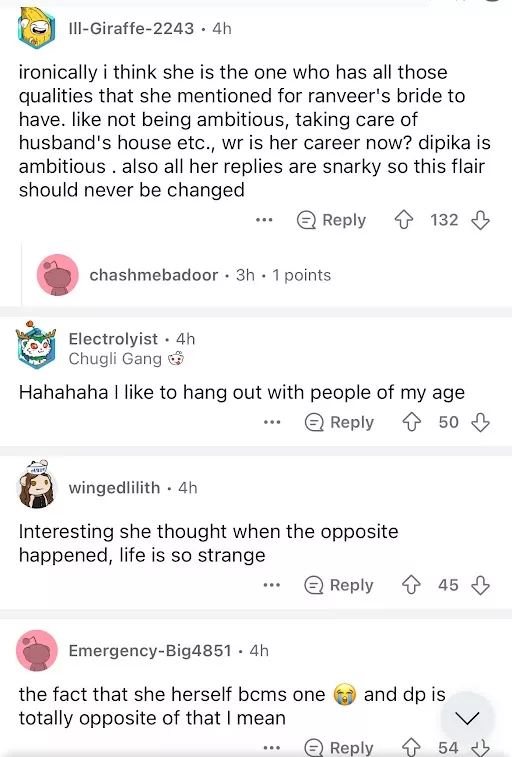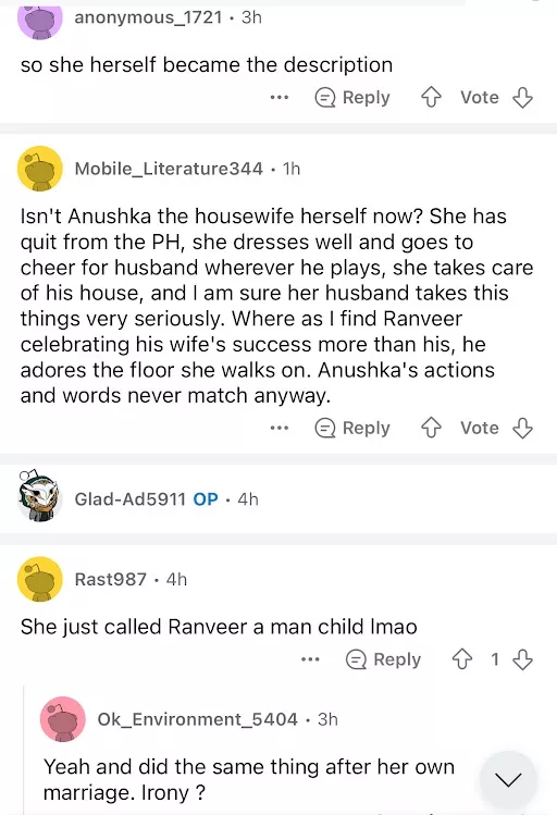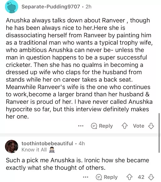 Now that Anushka Sharma's old interview has resurfaced on Reddit, the actress' statements didn't go down well with the netizens. They flooded the post's comment section and slammed Anushka for calling Ranveer a manchild and saying that the latter should get married to a housewife. A user stated, "Interesting she thought when the opposite happened, life is so strange." Another penned, "Lol she exactly become what she thought ranveer wanted and ranveer married the exact opposite."