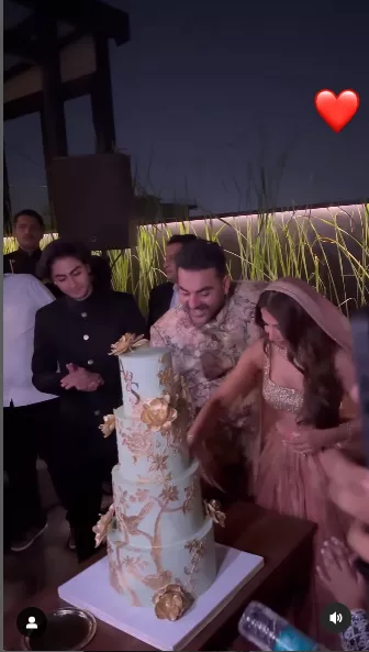 After the nikah ritual, Arbaaz and Sshura also cut a scrumptious cake among their close ones. In an inside video from their wedding, they were seen cutting a multi-layered blue-hued 3D cake adorned with edible flowers and more. The newly wedded couple was brimming with immense happiness as they cut the cake. Moreover, we spotted the doting son, Arhaan standing beside his father and cheering the newlywedded couple.