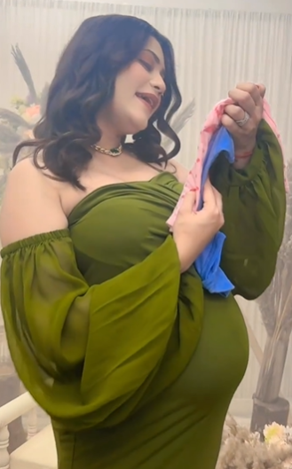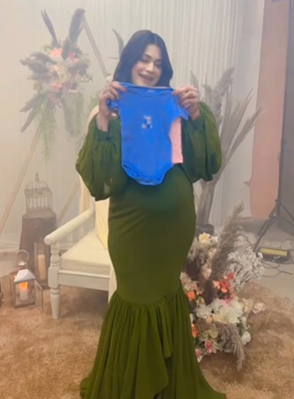 For the beautiful photoshoot, Kritika Malik looked gorgeous in a green-hued off-shoulder gown. Her outfit featured a body-hugging silhouette and balloon sleeves. However, the highlight of her gown was the fishtail finish at the bottom, which added charm to her look. Leaving her tresses open in wavy curls, Kritika opted for glam makeup to complete her look. She accessorised her outfit with a dainty neckpiece and flaunted her baby bump in the cutest way possible.