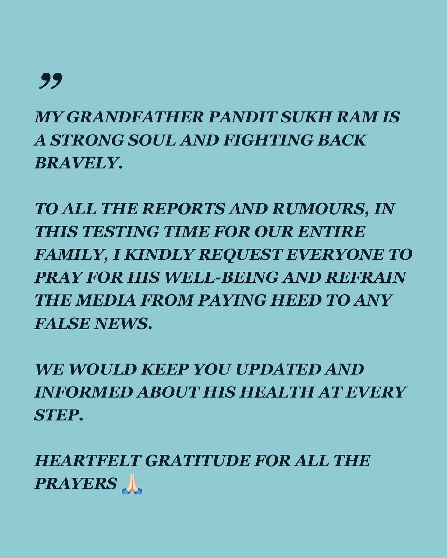 "My grandfather Pandit Sukh Ram is a strong soul and is fighting back bravely. To all the reports and rumours, in this testing time for our entire family, I kindly request everyone to pray for his well-being and refrain from the media from paying heed to any false news. We would keep you updated and informed about his health at every step. Heartfelt gratitude for all the prayers."