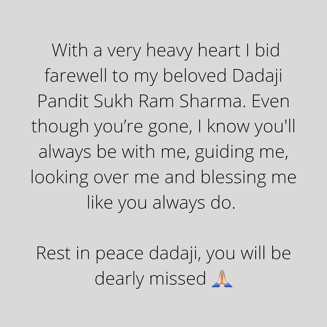 "With a very heavy heart, I bid farewell to my beloved Dadaji Pandit Sukh Ram Sharma. Even though you're gone, I know you'll always be with me, guiding me and looking over me and blessing me like you always do. Rest in peace Dadaji, you will be missed.