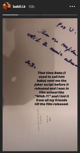 On August 7, 2020, late Bollywood great, Irrfan Khan's son, Babil Khan took to his Instagram stories and posted two pictures of the two surprise gifts he had received from his late father. The first picture is of Oscar-winning film, Joker's script. Yes! You read it right, and the actor had gifted this script to his son even before the release of the film. On the script, we can see a message scribbled by the late actor, and it can be read as "For U. These are confidential until the movie releases. Baba" And, his son, Babil too penned a caption atop it, which can be read as "That time Baba (I used to call him baba) sent me the Joker script before it released and I was in film school like "WHA-?!" and I hid it from all my friends till the film released." The next picture is of the script of another Oscar-winning movie, Jojo Rabbit and revealing the same, Babil wrote, "And this" atop. Take a look.