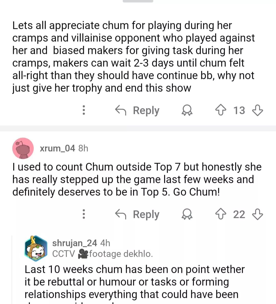 One user on Reddit wrote, "Let us all appreciate Chum for playing during her cramps and villanise opponent who played against her." They also called the makers biased for giving her tasks during her cramps, while also lauded her for enduring the pain and still fighting. One user also noted, "Periods were an additive to her and loved how she didn't even care to mention that once and kept going."