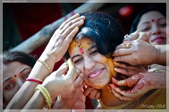 On the start of dawn, the wedding rituals of a Bengali couple begins with dodhi mongol, which is held at bride and groom’s respective places. Later, in the morning of the wedding day, elders of the family (generally father or uncle), perform the vridhi puja, wherein, prayers to the ancestors are made. This is followed by the ladies of the house going to a nearby water source and bringing a pot of water, with which the bride-to-be and the groom-to-be takes shower at their individual places. Before which, there is the holud kota ceremony, wherein, all the ladies of the house crush raw turmeric and apply some to the bride and groom. Some families also have a tradition, wherein the leftover haldi from the groom is brought from his house, which is later on, applied on the bride.