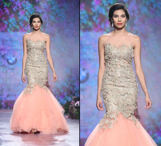 Yes, this is another good choice for your reception party. The style and pattern of the gown designed by Jyotsna Tiwari will make you stand apart from rest of the crowd. Just wear a pair of dangler earrings with your hair tied up in a bun.