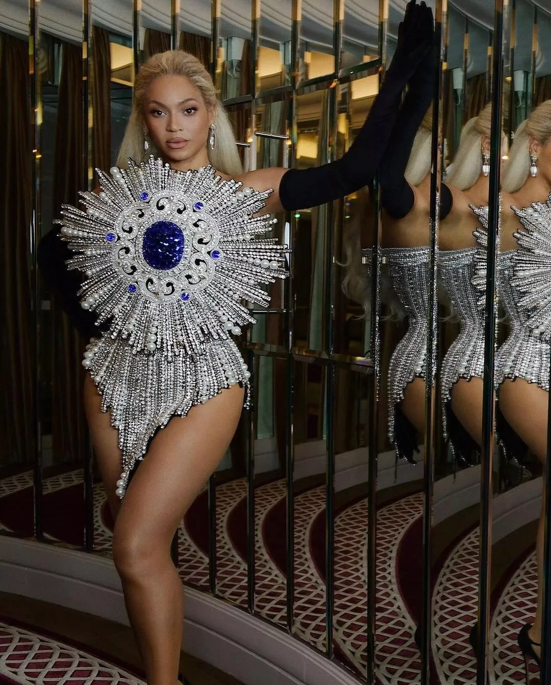 The dress is embellished with actual diamonds, pearls, and faceted sapphire crystals and was designed by Olivier Rousteing, who outfitted nearly all of Beyonce's Renaissance tour looks. The pop star styled her dress with arm-length gloves and platform heels. She accentuated her look with 20-carat diamond earrings by Lorraine Schwartz Jewelry, featuring rock crystal drops and a few diamond rings. However, we could not find any specific price tag for the dress or the jewellery, but we can certainly guess that it will be worth thousands, if not millions. The luxury fashion brand, Balmain took to its official Instagram account to share a few snaps of Beyonce in their bejewelled dress. They captioned the post as: