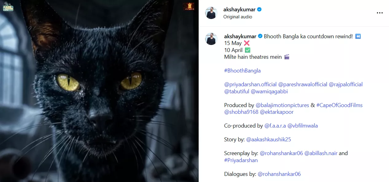 Akshay Kumar took to Instagram on Saturday, February 7, 2026, to share a promo announcing the new release date of Bhooth Bangla. The spooky video shows a cat leaping onto a shelf and scratching out the May 15, 2026 date on a calendar, revealing the new release date as April 10, 2026 (Friday). Akshay's post could be quoted as: