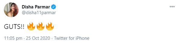 In the nomination episode of Bigg Boss 14, television actor, Rahul Vaidya nominated housemate and young singer, Jaan Kumar Sanu and also called him a product of nepotism in the house. Going further in his clash with Jaan, the actor stated that the makers of the show are favouring Jaan Kumar because he's the son of legendary singer, Kumar Sanu. Soon after the promo was released by the channel, Rahul's alleged girlfriend, Disha Parmar took to her Twitter handle and reacted on the same with her tweet that can be read as "GUTS!!" followed by fire emoticons. Take a look:
