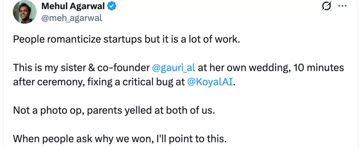"People romanticize startups but it is a lot of work. This is my sister & co-founder @gauri_al at her own wedding, 10 minutes after ceremony, fixing a critical bug at @KoyalAINot a photo op, parents yelled at both of us. When people ask why we won, I'll point to this."